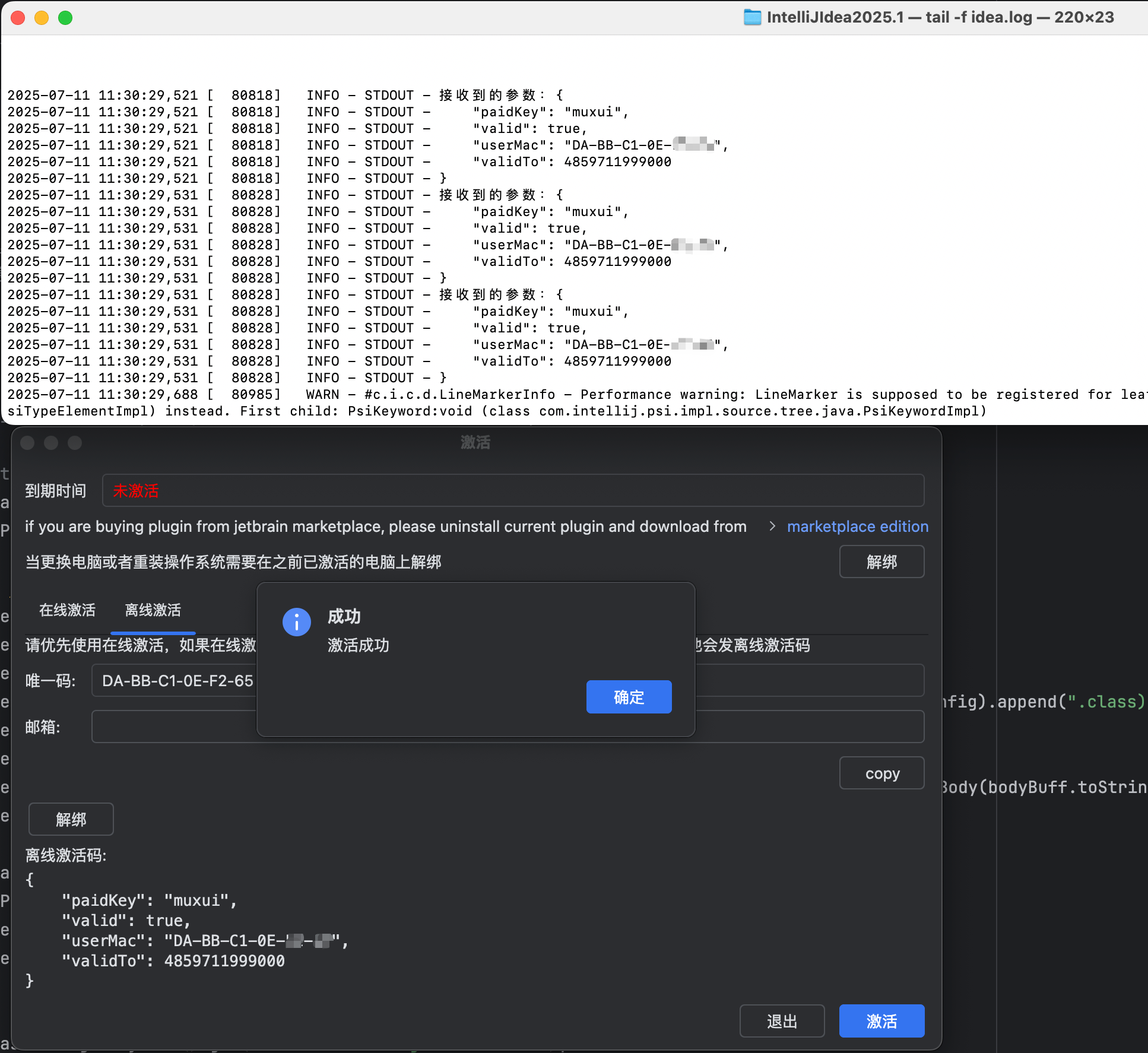 "userMac": "离线激活时显示的唯一码",